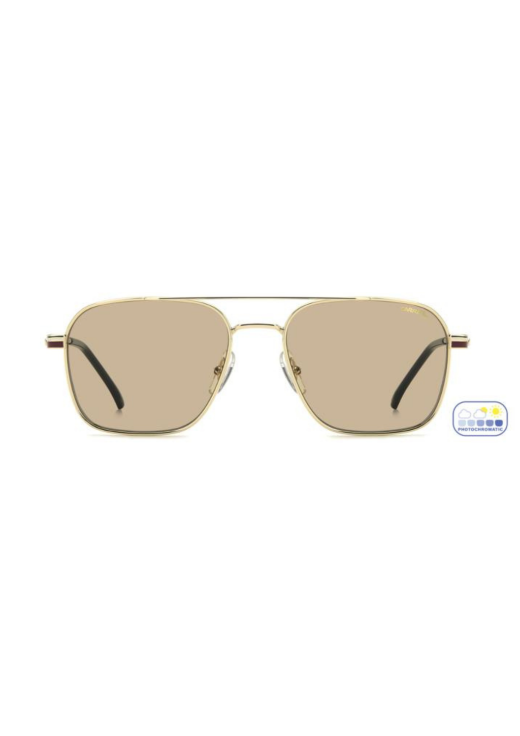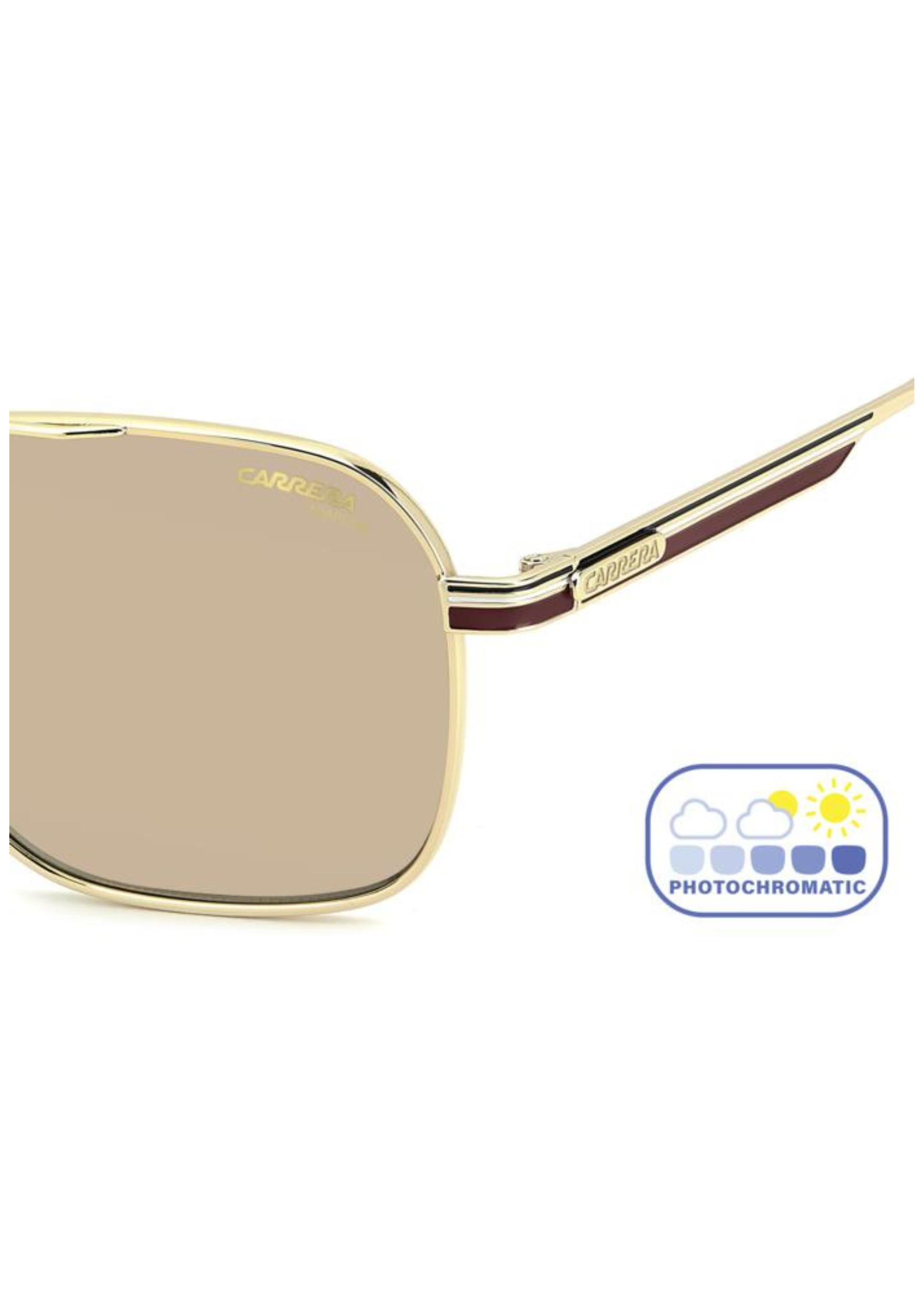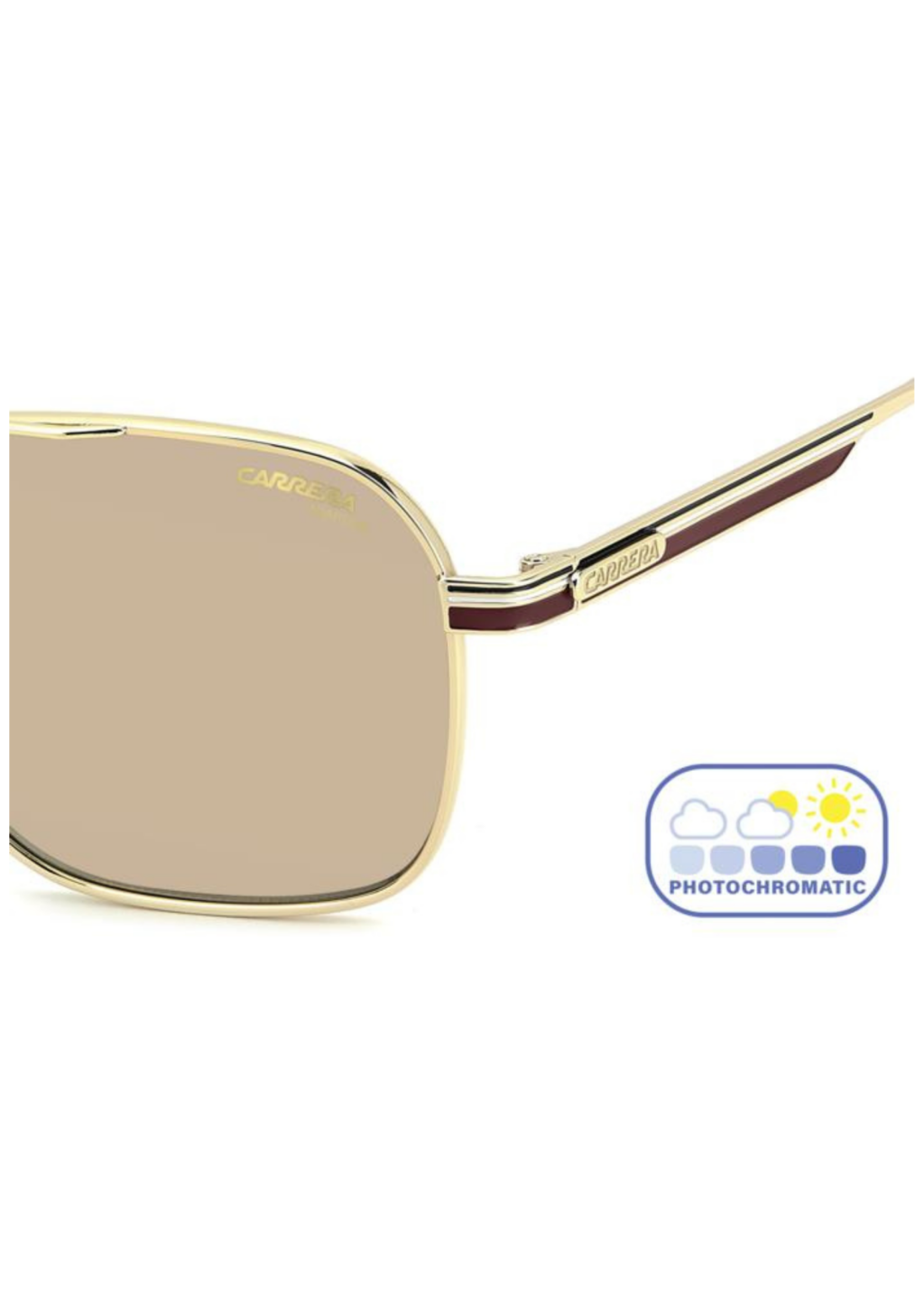 Αντρικό γυαλί, επώνυμο και στυλάτο σε μεταλλικό χρυσό σκελετό με μπορντώ λεπτομέριες και μπέζ-καφέ φωτοχρωματικούς φακούς.